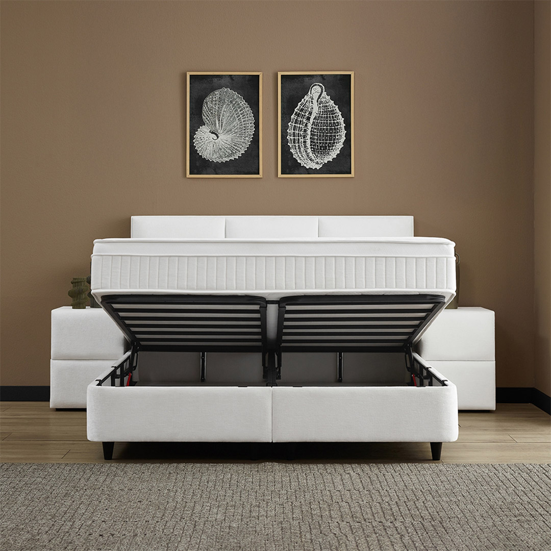 Ce lit boxspring offre une solution élégante et pratique pour maximiser l’espace de votre chambre à coucher. Doté d’un espace de rangement intégré sous le matelas, il permet de garder votre espace de vie ordonné en cachant astucieusement vos affaires. Idéal pour ceux qui cherchent à combiner confort, style et fonctionnalité dans leur sanctuaire personnel.
